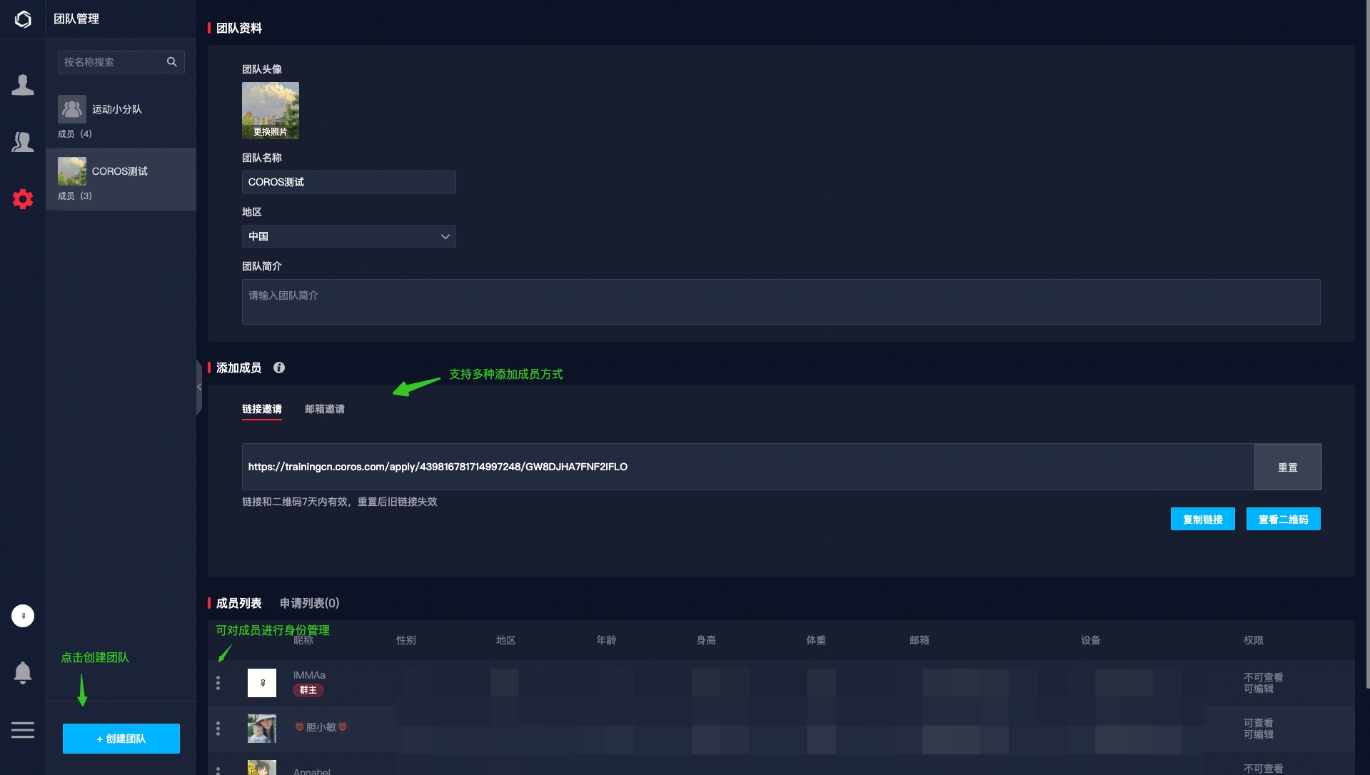發送給指定使用者後,使用者點擊連結或掃描二維碼,進入登錄頁面輸入COROS帳號,輸入備註資訊提交即可; 教練及管理員在申請清單審核資訊,可同意或拒絕加入申請,完成添加成員操作。