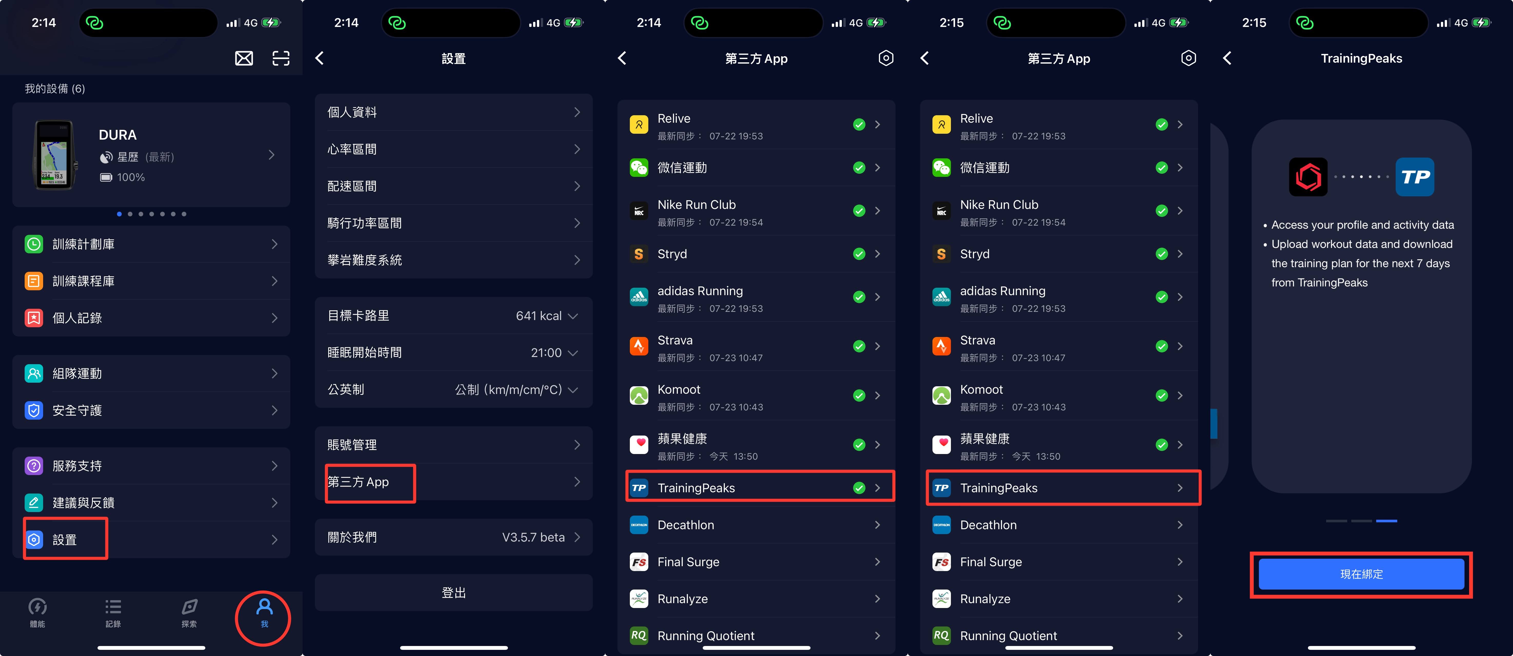 * 向下滾動並選擇  「設置」 → 「第三方APP」 → 「TrainingPeaks」。